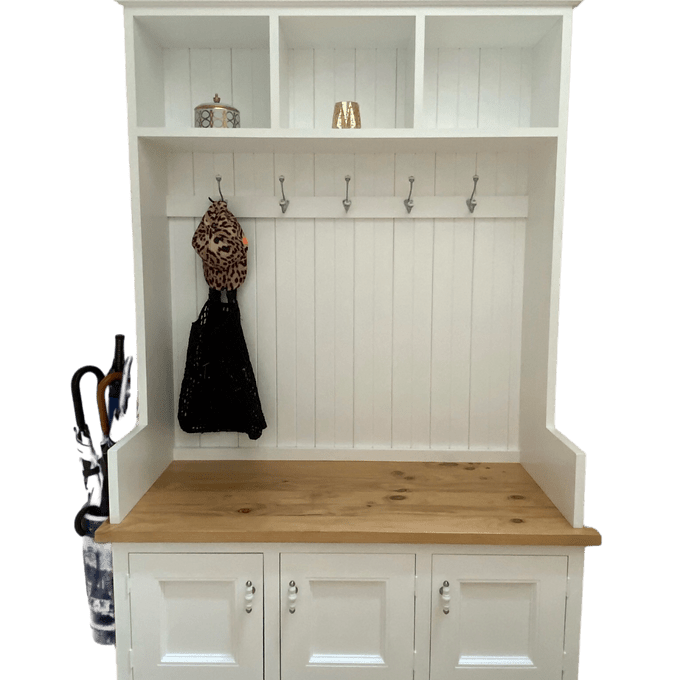 2000 high 1200 wide 500 depth mudroom stand with stained seat and deluxe handles.