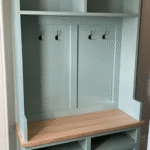 2000 high 1200 wide 400 depth mudroom stand with stained seat and drawers.