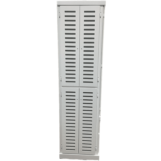 Tall and narrow shoe cabinet with slatted doors and adjustable shelves. Painted white. FROM $1299